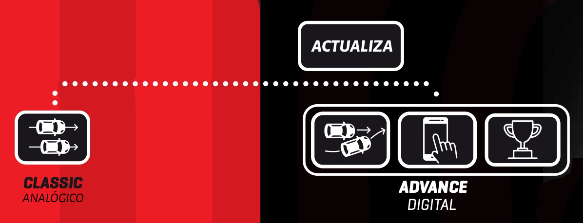 Con el accesorio adecuado puedes transformarlo en Scalextric Advance, el sistema digital necesario para conectar con la App que multiplica la diversión: más coches, más adelantamientos, más estrategia.